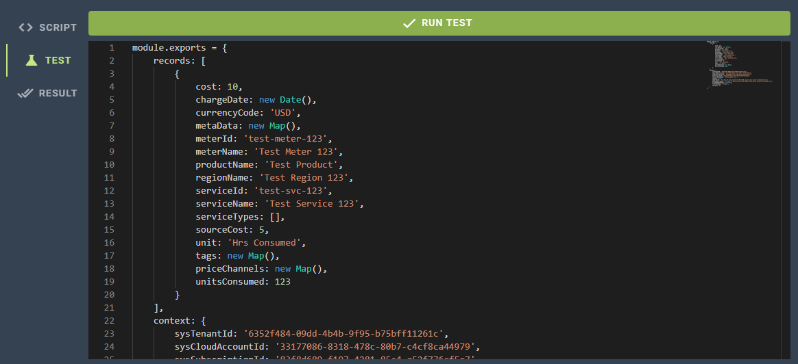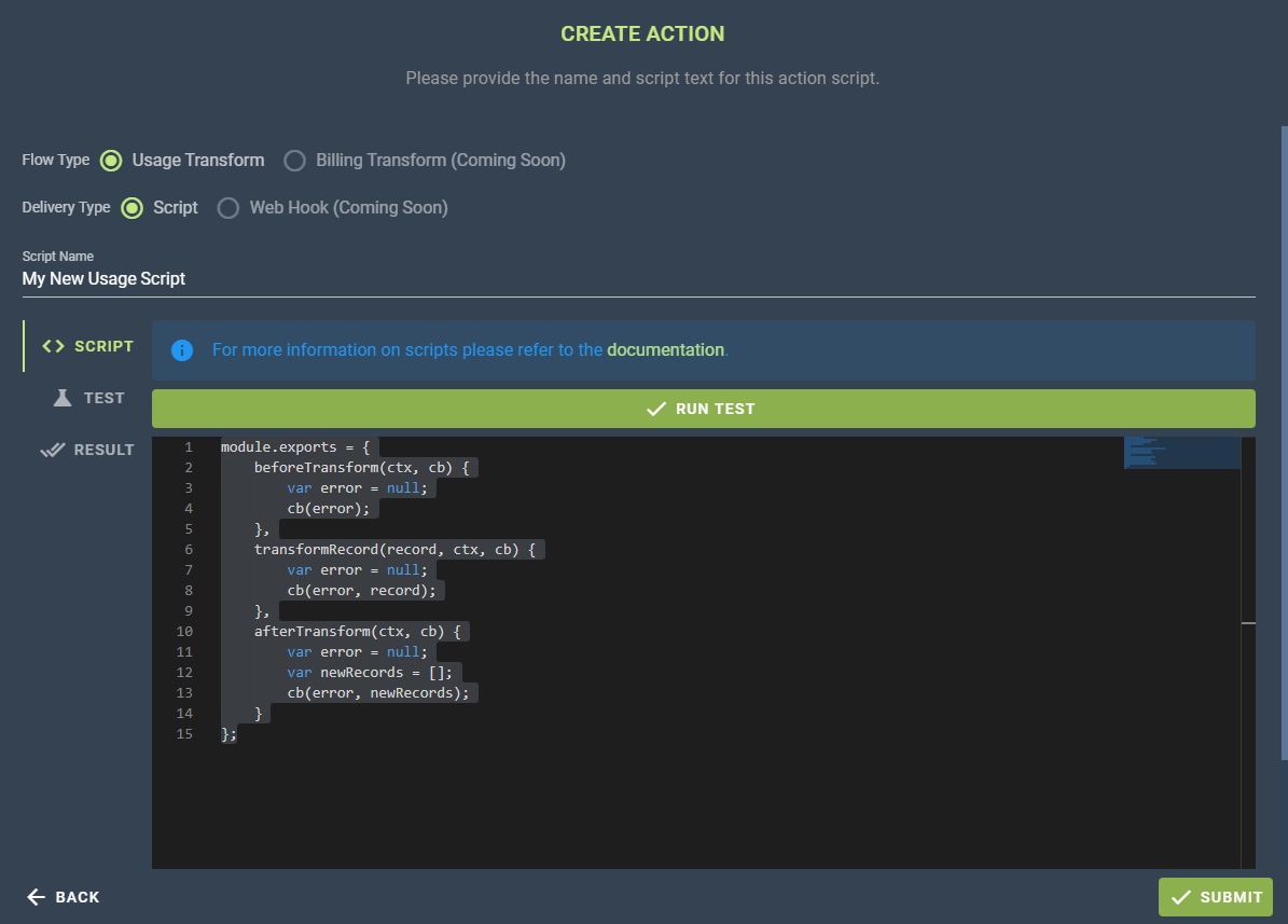 This is the guts of the usage transformation. The transformRecord function is executed on one usage record after the other until the entire set of imported usage is processed. By default the transformRecord will be the following when created: